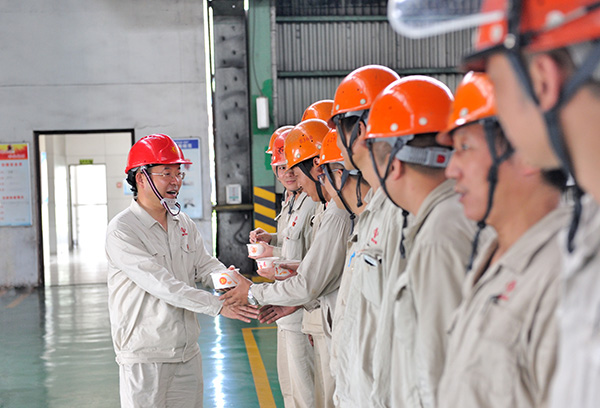 在加热炉旁,李总将一碗碗西瓜汤送到现场员工手上。“有合同我们才有活干,有活干我们才有效益,大家一定要倍加珍惜,抓住机遇、努力拼搏,特别是基层党组织和党员干部要充分发挥模范带头作用,要争当‘四强四优’的排头兵、急先锋。”